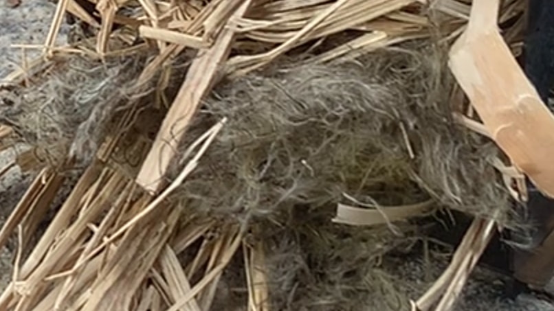 Flausch und Gras. Im letzten Video mit Tommy hatte ich diesen Zunder getestet. Auch heute mische ich vertrocknete Gräser und kleine Holzstücke mit hinzu.